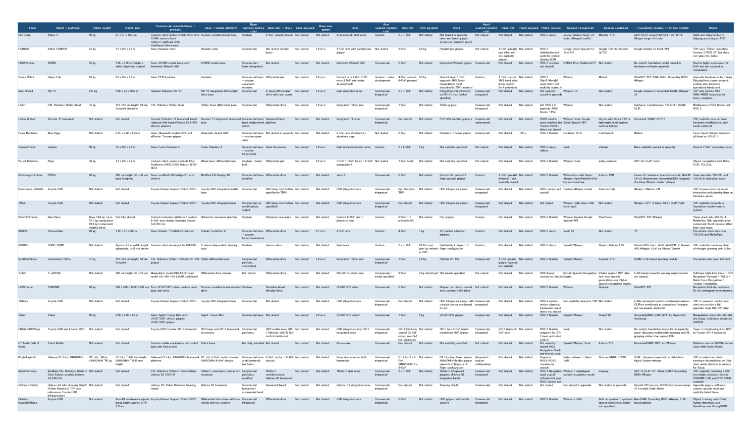 下記のサイトで公開されているRoboCup2026世界大会 RoboCup@Homeに出場予定の各チームの技術資料をChatGPTにまとめてもらいましたので添付します。